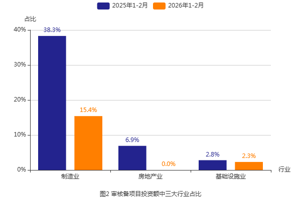 2026年1-2月,基础设施业、制造业、房地产业三大板块审核备项目计划投资额为13.44亿元,基础设施投资额同比下降56.4%、制造业投资额同比下降84.1%、房地产业投资额同比下降100%;三大板块项目投资额占审核备项目投资总额的17.8%,其中:制造业占比15.4%,房地产业占比0%,基础设施业占比2.3%。基础设施业、制造业、房地产业三大行业审核备项目投资额占比变化情况如图2。