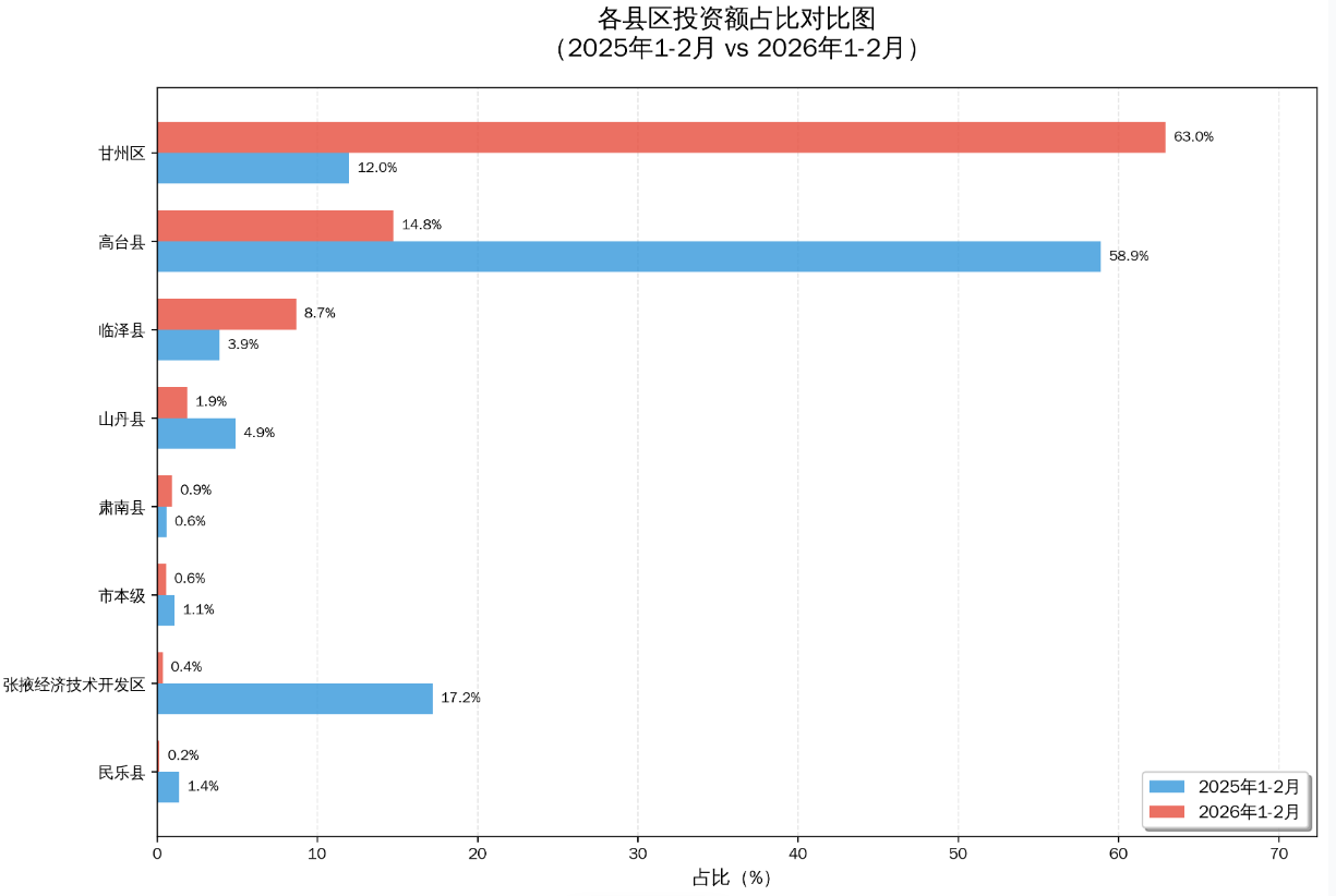 对比2025年1-2月份投资占比情况,2026年1-2月份审核备项目计划投资额占比情况:甘州区占比从12%上升至63%,提升幅度达51个百分点;临泽县(3.9%→8.7%)和肃南县(0.6%→0.9%)占比略有上升;高台县占比从58.9%大幅下降至14.8%,下降44.1个百分点;张掖经济技术开发区占比从17.2%下降至0.4%,下降16.8个百分点;民乐县占比从1.4% 下降至0.2%;市本级(1.1%→0.6%)和山丹县(4.9%→1.9%)占比小幅下降。投资占比变化情况如下图。