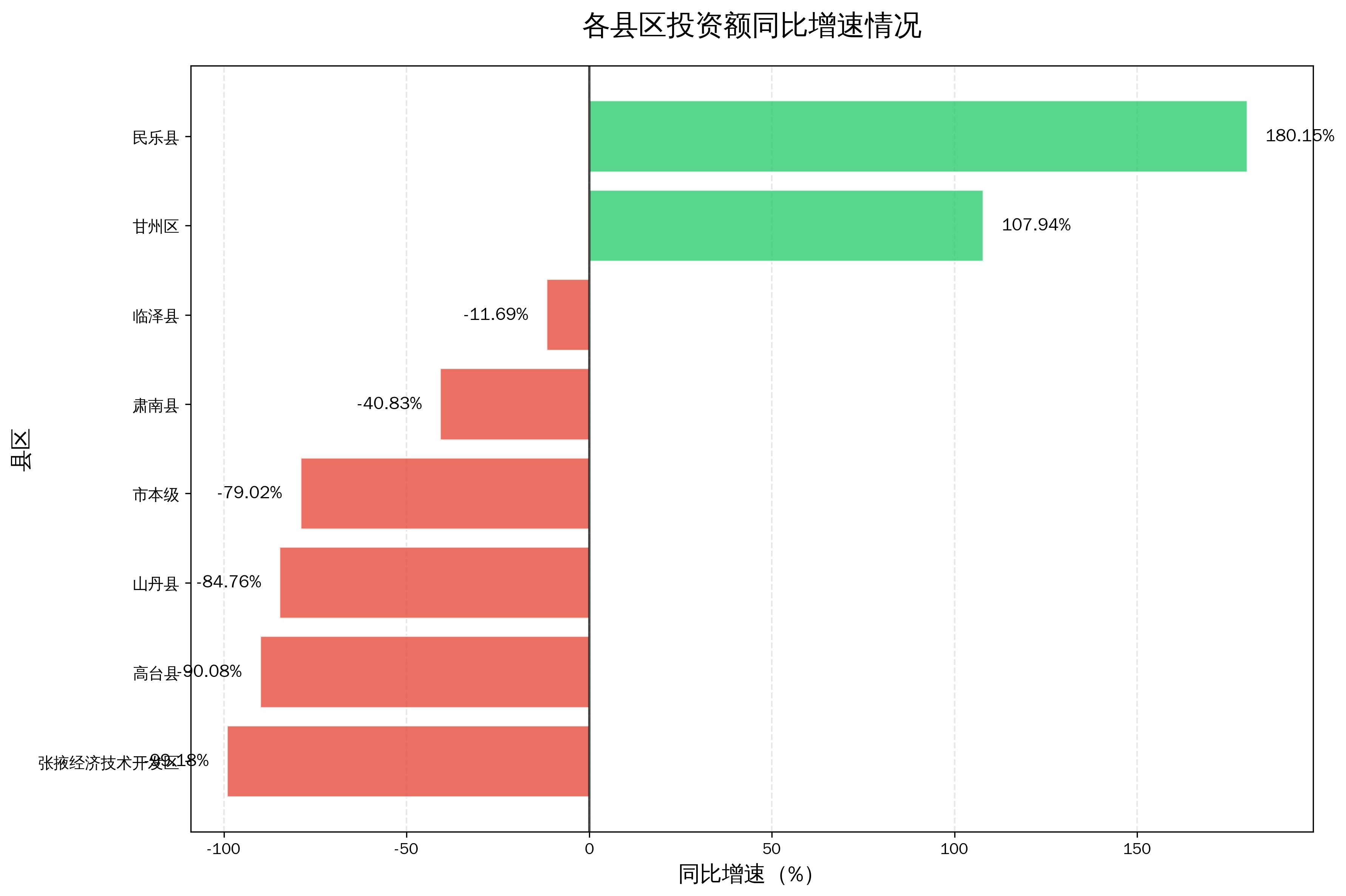 2026年1-2月份审核备项目计划投资额增速,仅甘州区和民乐县实现投资额同比正增长,其余县区均为负增长,区域投资增速分化显著。投资额增速情况如下图。