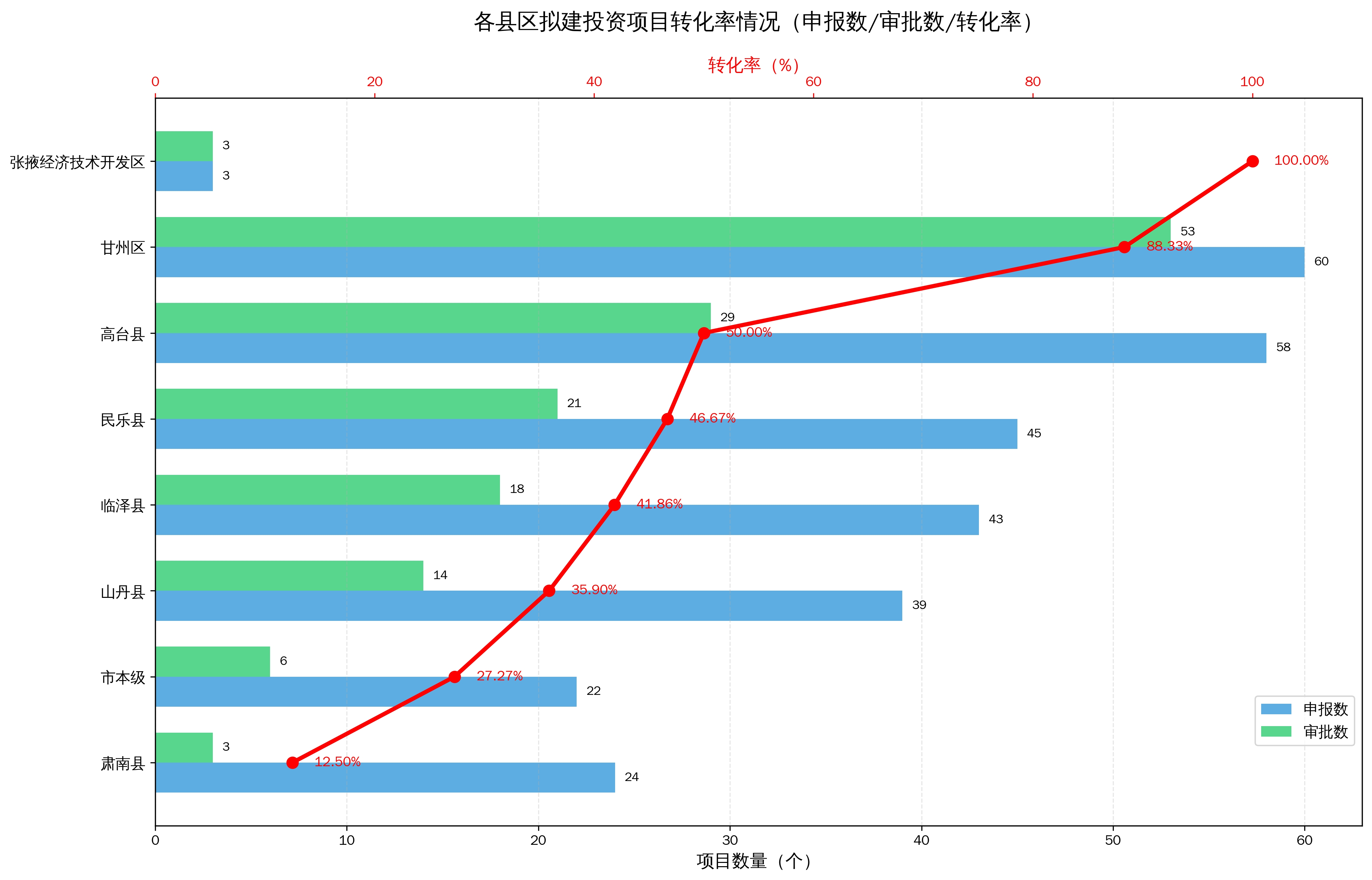 2026年1-2月,通过投资项目在线审批监管平台申报项目294项,已完成审核备项目147项,全市拟建投资项目平均转化率为50%。其中:张掖经济技术开发区转化率为100%(申报3个、审批3个);甘州区转化率为88.33%(申报60个、审批53个),申报量最大区域中审批效率最高;高台县(50%)、民乐县(46.67%)、临泽县(41.86%)、山丹县(35.9%)转化率处于35%-50%区间,申报数均在39-58个之间;肃南县转化率12.5%(申报24个、审批3个),审批效率偏低。投资项目转化率情况如下图。