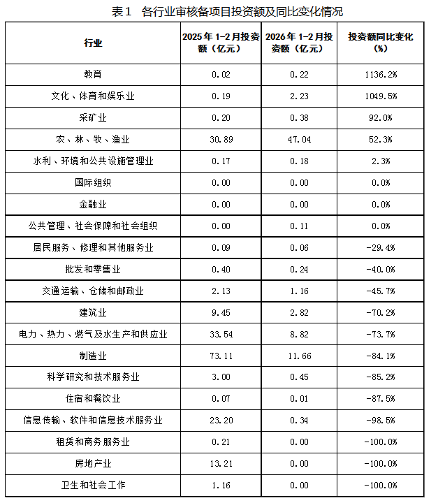 从投资项目在线审批监管平台数据统计,2026年1-2月,全市审批、核准、备案(以下简称审核备)办理项目数为147项,同比下降21.81%,审核备项目计划投资总额为75.71亿元,同比下降60.37%。