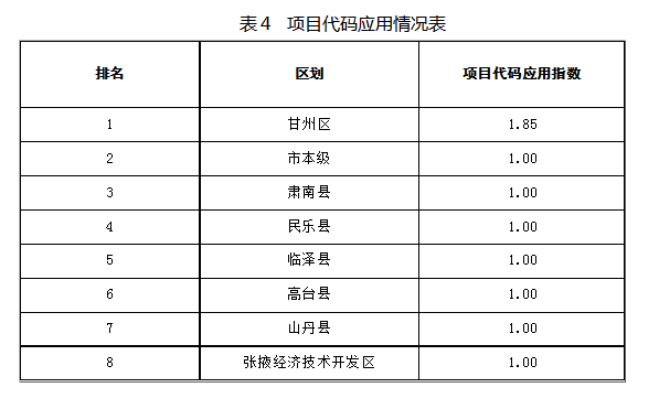 在线平台生成的项目代码作为项目整个建设周期的唯一身份标识,是各有关部门用以开展项目调度工作,加强协同管理和提高服务水平的基本手段。项目代码应用指数,以在线平台监测到的项目代码在项目前期手续办理申报时的应用情况为衡量标准。该指数反应的是审批信息通过项目代码在“在线平台”上归集的充分程度,指数越高应用情况越好。市本级及各县区项目代码应用指数如下(表4)。