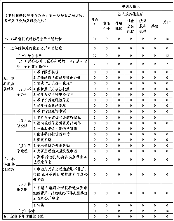 (二)依申请公开情况。严格落实依申请公开工作规范,健全完善“接收-审核-办理-答复-归档”全流程闭环管理,明确办理时限和责任分工,确保群众申请“件件有回应、事事有落实”。全年收到并答复依申请公开16个,全部为公民个人申请。本年度没有行政复议和行政诉讼事项。