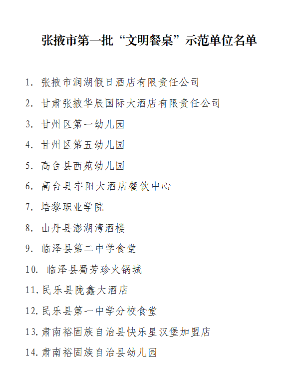 为认真贯彻习近平总书记关于制止餐饮浪费的重要指示精神,全面落实《反食品浪费法》《甘肃省反餐饮浪费条例》等法律法规和省委省政府、市委市政府工作部署,深入推进“倡导文明餐桌、制止餐饮浪费”行动,促进公众形成文明、节约、健康、科学的饮食习惯,助力创建全国文明城市,维护人民身体健康和食品安全,根据张掖市市场监督管理局《关于评选张掖市第一批“文明餐桌”示范单位的通知》(张市监函[2022] 91号)精神,自2022年6月份以来,经餐饮单位自愿申报、县区市场监管局审核验收、信用信息查询、市局复查审定等程序,经局党组会议研究,现将评定张掖市润湖假日酒店有限责任公司等14家单位为“文明餐桌”示范企业予以公示。