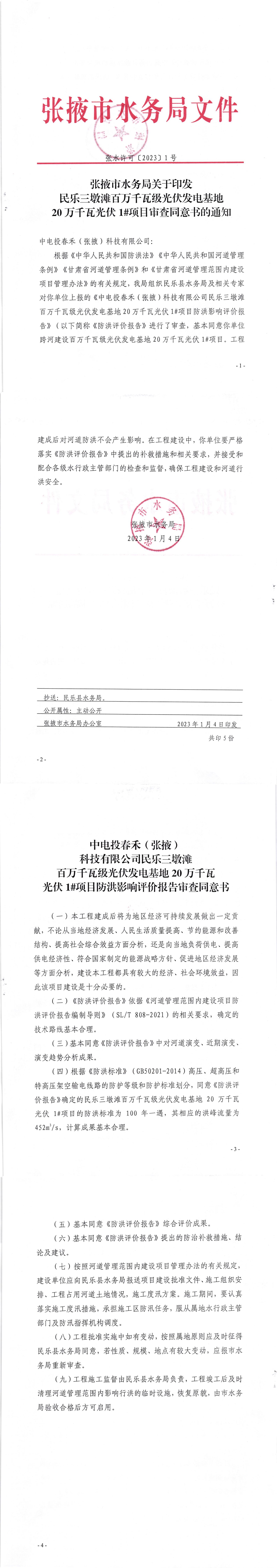 标题: 张掖市水务局关于印发民乐三墩滩百万千瓦级光伏发电基地20万千瓦光伏1#项目审查同意书的通知