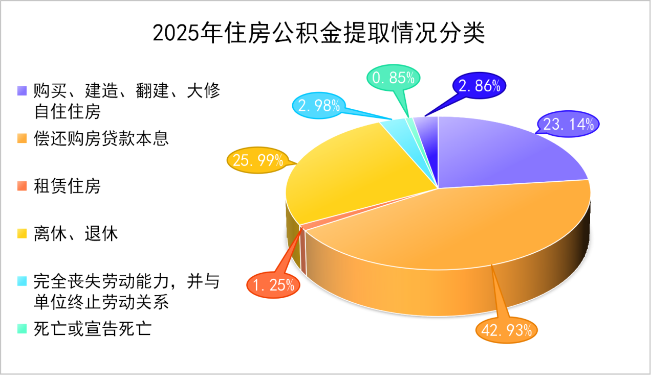 张掖中心深入贯彻落实中央城市工作会议精神,顺应发展形势、创新工作举措,充分发挥住房公积金制度在城市更新中的积极作用,持续优化使用政策、精简办理流程、提升服务质效,切实满足缴存人租房、购房、还贷等多元化资金使用需求,充分展现住房公积金制度的民生底色与保障导向,有力提振了住房消费市场活力,为我市现代化建设注入了强劲动能。2025年,购买、建造、翻建、大修自住住房占23.14%,偿还购房贷款本息占42.93%,租赁住房占1.25%,离休和退休提取占25.99%,完全丧失劳动能力并与单位终止劳动关系提取占2.98%,出境定居占0%,死亡或宣告死亡占0.85%,其他占2.86%。住房消费类提取占据主导地位,充分体现了住房公积金“主要解决住房问题”的核心功能。