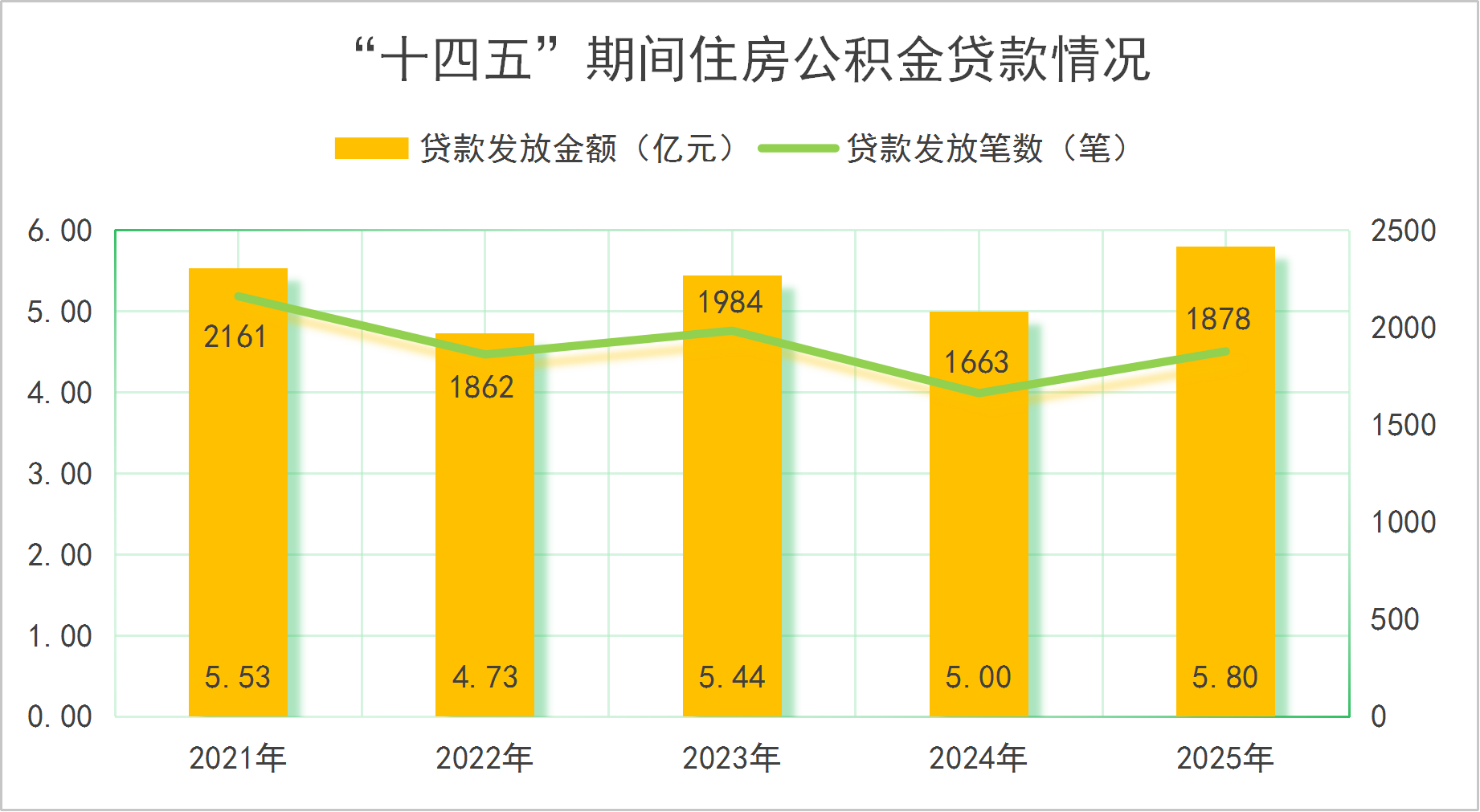 张掖中心始终坚守“房住不炒”定位,牢牢把握住房的民生属性与保障功能,充分发挥住房公积金定向支持、普惠低息、存贷挂钩的制度优势,精准对接群众刚性和改善性住房需求,用心用情办好住房民生实事,让安居福祉真正惠及千家万户。2025年,发放个人住房贷款1878笔5.8亿元,同比分别增长12.93%、16.23%,为广大缴存人实现安居梦想提供了可靠的资金支持。“十四五”期间,共发放住房公积金贷款26.50亿元,住房公积金贷款在全市个人住房贷款市场中的占比逐年提高,并连续多年稳居首位。2025年,住房公积金住房贷款市场占有率达到31.98%,比上年末增加0.23个百分点,住房公积金已成为我市居民改善住房条件的主要渠道。
